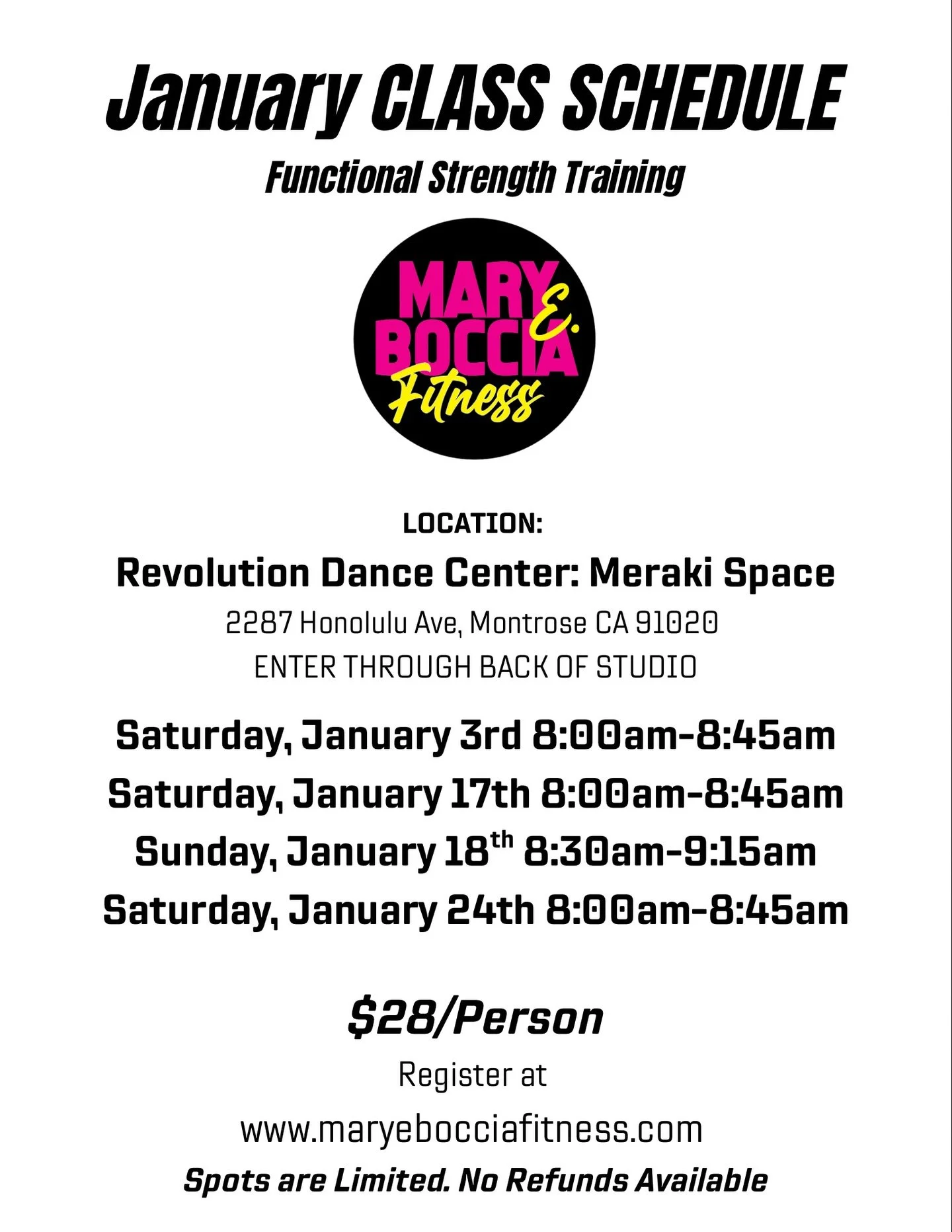 Functional Strength Training: Time: Saturday Mornings. Location: The Meraki Space, Revolution Dance Center